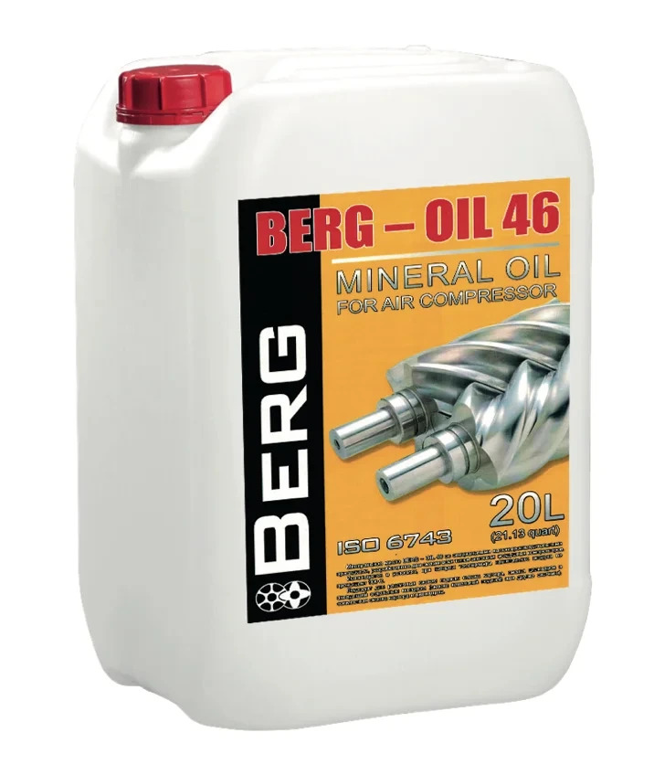 BERG-Oil 46 (20 l) — BERG zavodi tomonidan rasman tavsiya etilgan mineral kompressor moyidir. U vintlama ham, porshenli kompressorlarda ham, shu jumladan harorati 150°C gacha bo‘lgan qiyin sharoitlarda foydalanish uchun mos keladi.